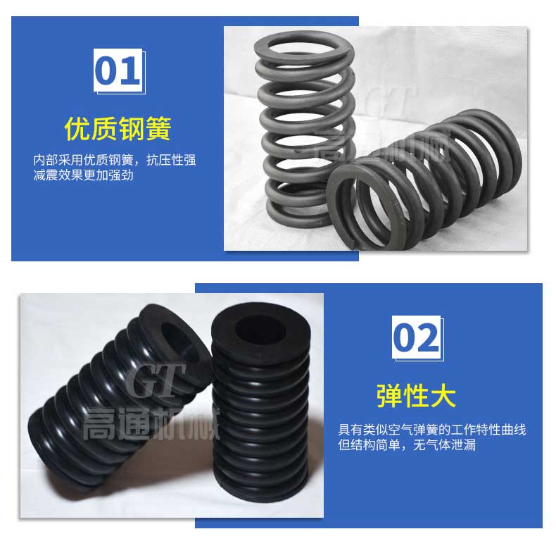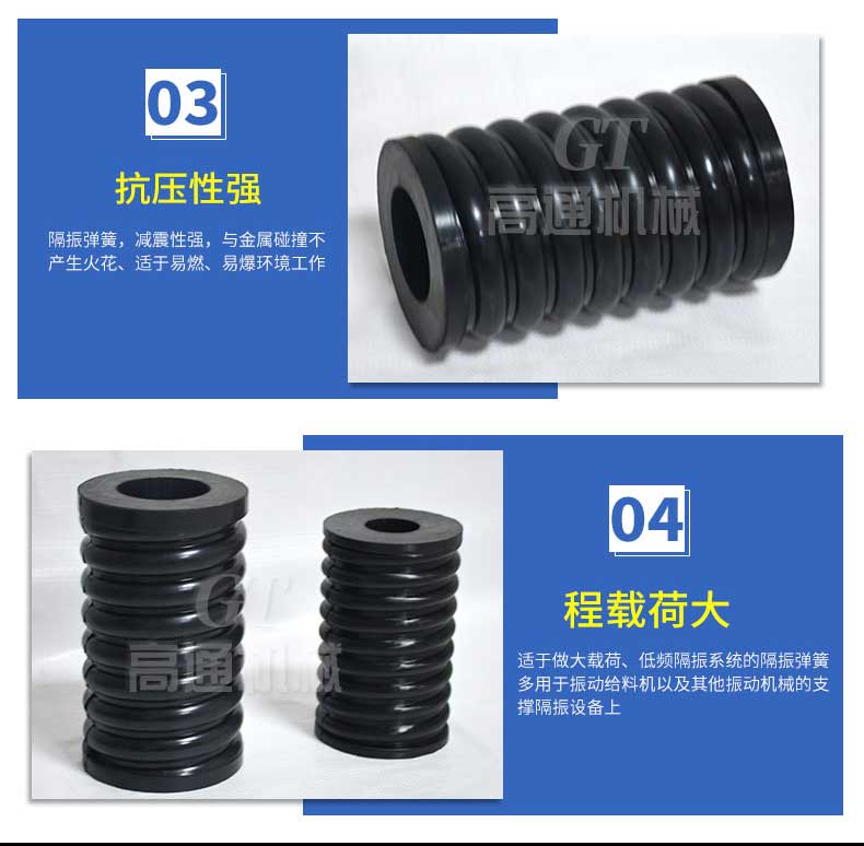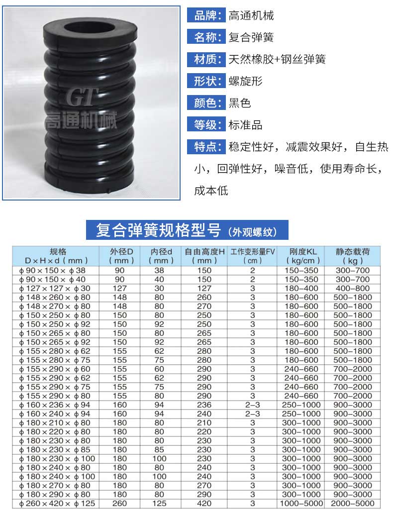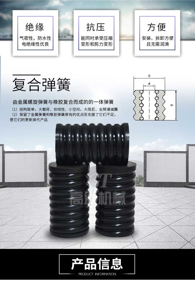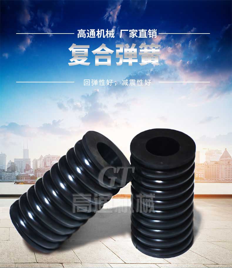 復合彈簧是由金屬螺旋彈簧和橡膠復合為一體的彈性體,集金屬彈簧和橡膠彈簧的優點于一體,并克服兩者的缺點。形狀和機械性能穩定,能承受載荷和大變形量。隔振降噪效果好,具有工作平穩,共振區時間短等優點,尤其適用于礦山、冶金、煤炭等行業的大型振動設備或大型減震設備。